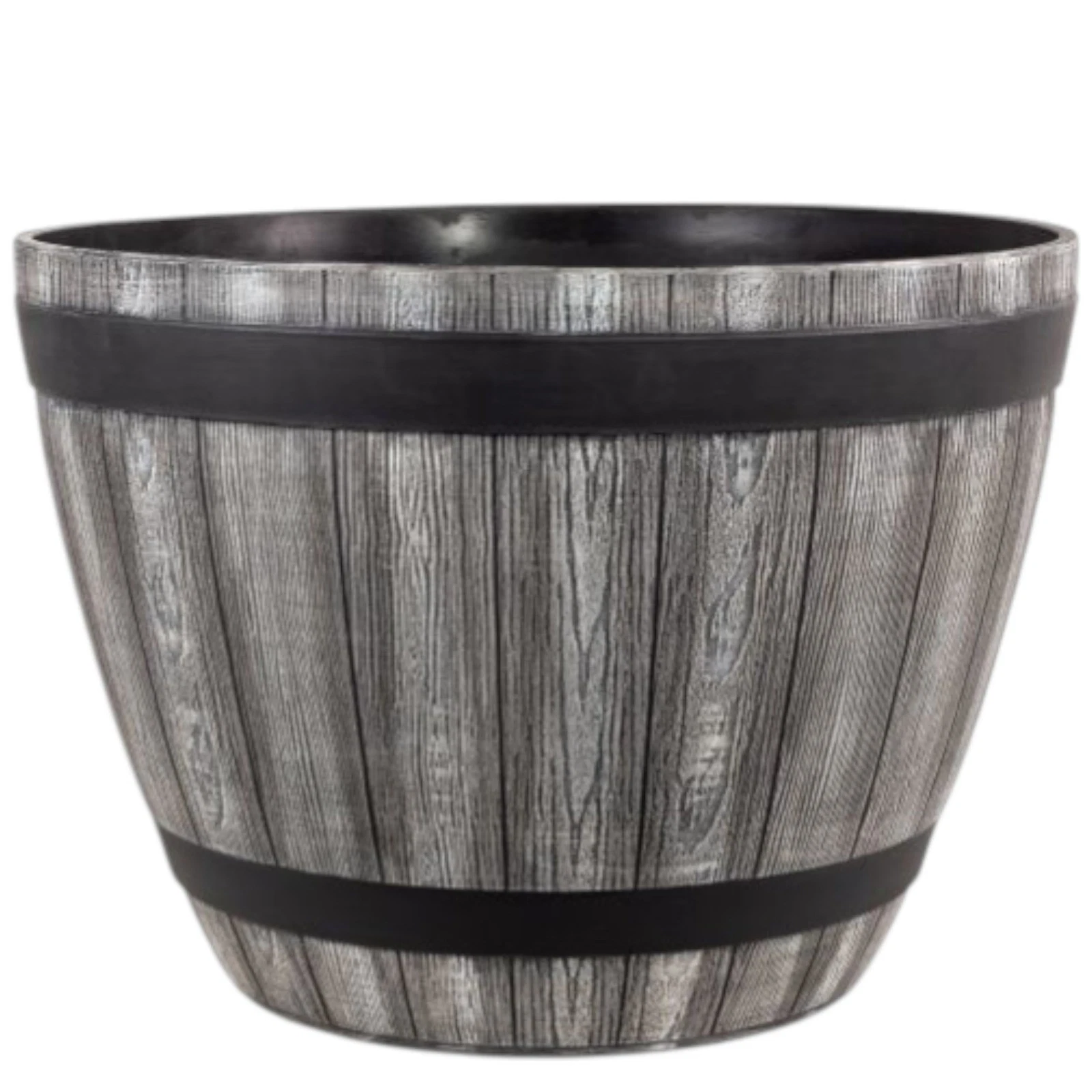 • Rustic Wood Look: Durable plastic construction with authentic grey wood-grain effect and black hoops for a vintage barrel design.